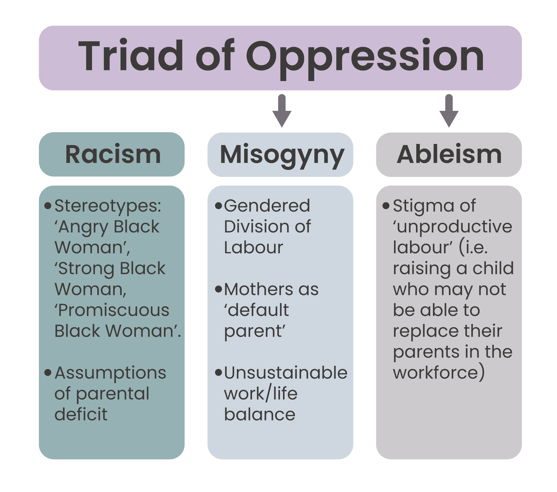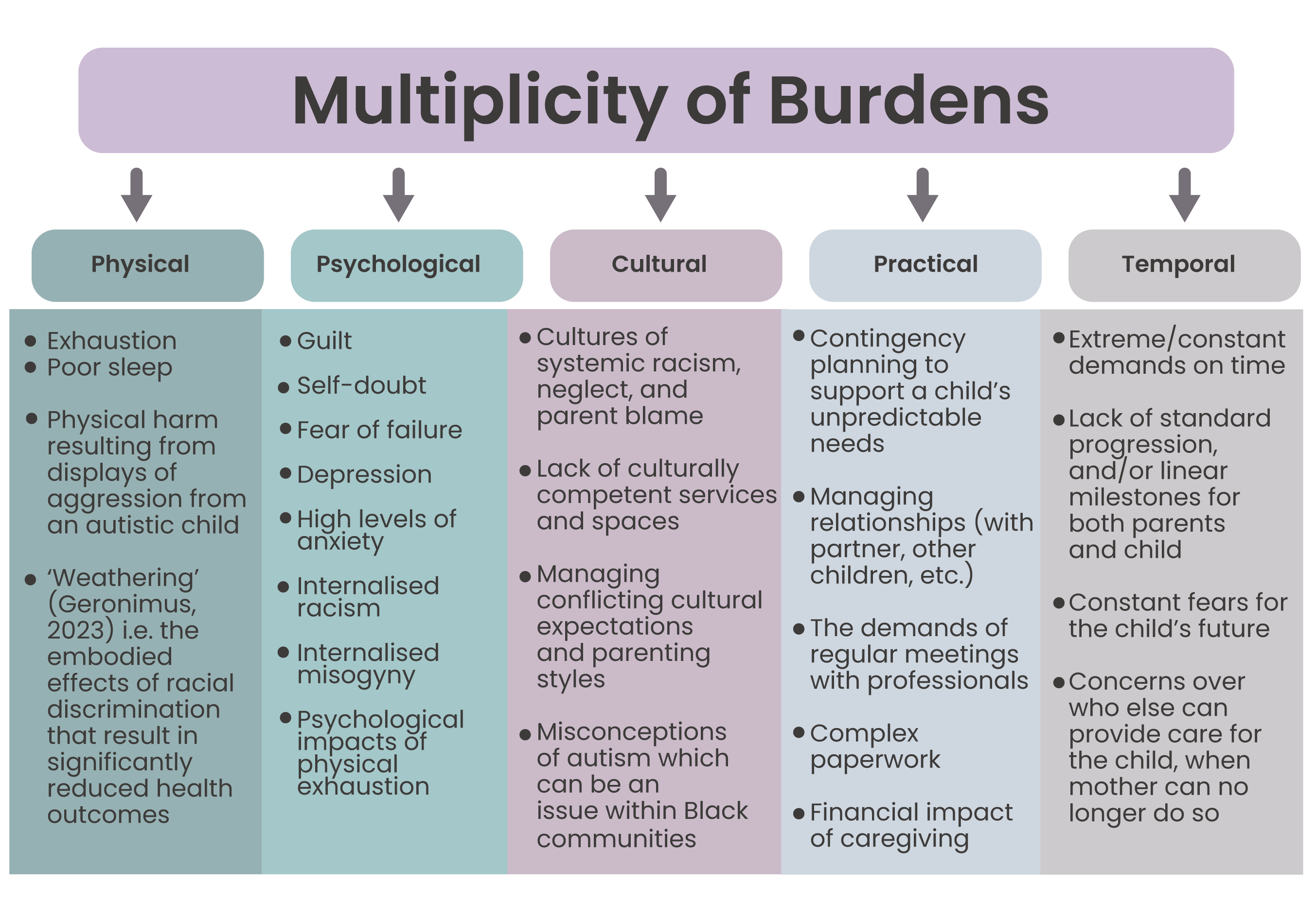 Our research identified this increased mental load as being one of several ‘burdens’ borne by Black mothers of autistic children. As detailed in the book, the word ‘burden’ is used advisedly to speak to the consequences of marginalisation and oppression, and the debilitating effects in which they result. It is not intended as a label for the children themselves, who are anything but burdensome in the eyes of the mothers who advocate for them. Rather, it is the ‘triad of oppression’ which gives rise to the ‘multiplicity of burdens’, the impact of which is detailed in the diagram below.