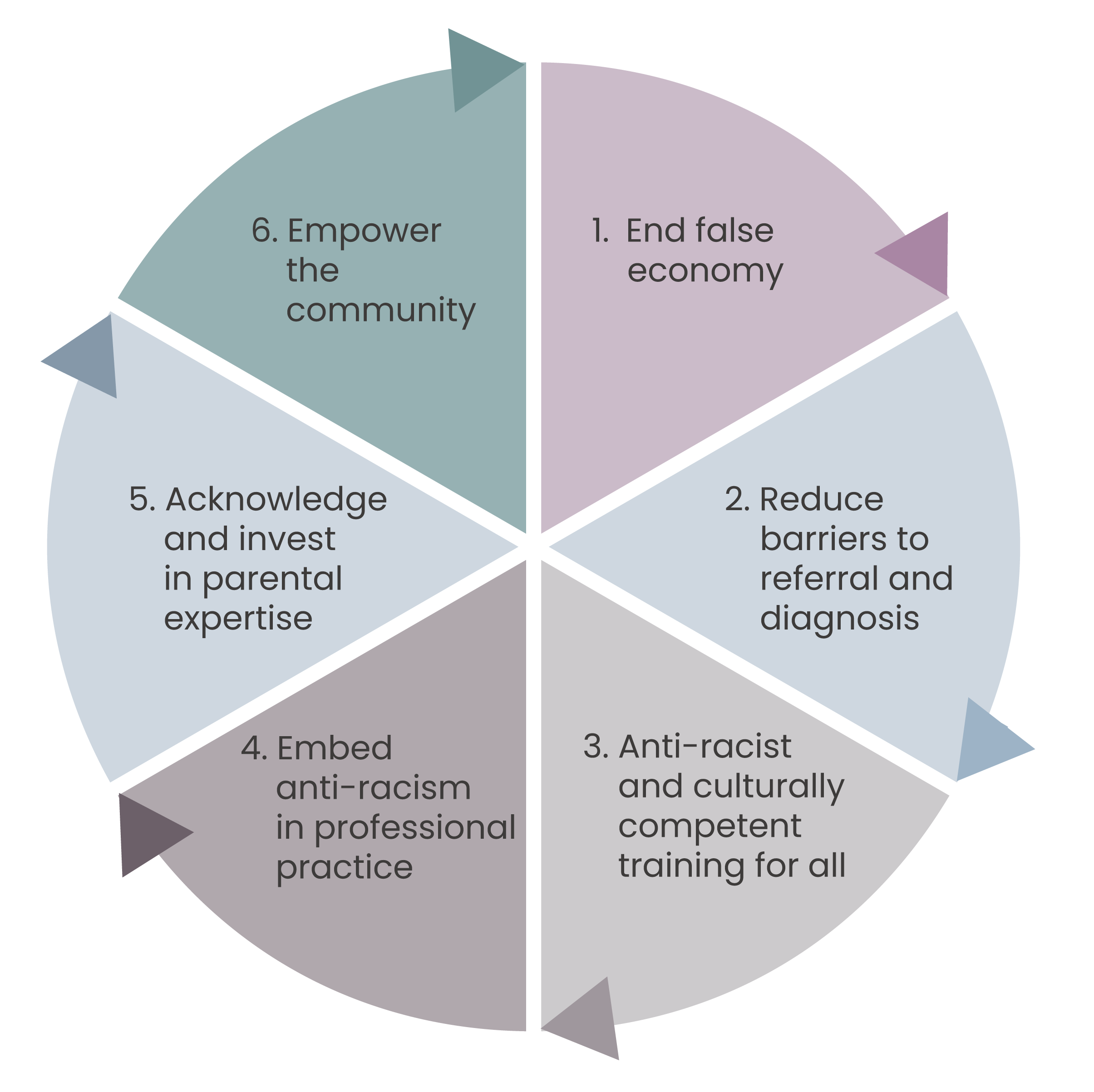When we recruited participants for our research, Mel and I made a promise both to each other and to our fellow ‘othered mothers’ that in sharing our stories we would seek to build a ‘community of resistance’ focused on meaningful transformation of a broken system (Malcolm and Green, 2025, p. 15). It is not sufficient to highlight the challenges faced by Black mothers of autistic children; our work also takes aim at systemic change that can alleviate the impact of the ‘multiplicity of burdens’. The resulting recommendations are as follows:
