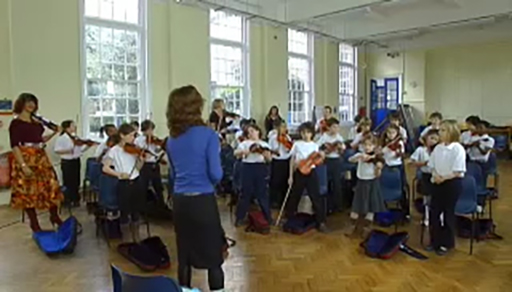 Watch the video from a whole class instrumental lesson with a key stage 2 class. Note how the lesson begins with music that continues into the first activity with the children. Very little is said.