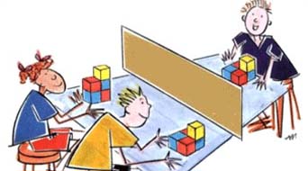 In the classroom activity illustrated here the students design a solid from a few coloured cubes and then describe it. The others in the group then try to visualise the configuration and make their own.