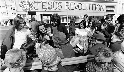 The first is of the demolition of a church building in Chesterfield, England, around 1968. The picture is evidence of a wider phenomenon: in England and Wales between 1951 and 1980 there was an 18 per cent reduction in places of worship (non-Anglican), with the greatest net losses between 1962 and 1972 (Field, 2017, p. 184). The Sixties are often seen as a period of decline for traditional Christianity; taking into account measurements such as the numbers of church attendance, buildings and clergy. The second picture shows global pop music icons the Beatles. In 1966, one of their songwriters, John Lennon, had famously said in an Evening Standard interview: “Christianity will go. It will vanish and shrink. I needn't argue about that; I'm right and I'll be proved right. We're more popular than Jesus now; I don't know which will go first – rock 'n' roll or Christianity.” Whether Lennon was being critical of traditional Christianity, or simply noting a generational shift away from traditional religion and toward popular culture, he and his bandmates nevertheless seemed interested in alternative forms of ‘spirituality’, visiting the Maharishi Mahesh Yogi in India two years later. But was Christianity dying? The third image, the Children of God evangelising in Brighton, shows one of a number of new expressions of Christianity – with an emphasis on experience, authenticity and community – which were emerging during the Sixties. The rise of what is known as ‘charismatic Christianity’ suggests that traditional religion was also able to renew itself from within.