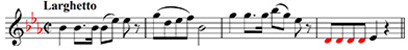 On the treble staff the note sitting on the first ledger line above the staff is a B. However, the key signature of three flats signifies that all Bs in this extract (unless modified by accidentals) are Bs.