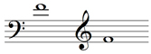 The concept of ledger lines can also be applied at the top of the treble staff and at the bottom of the bass staff (Example 9).
