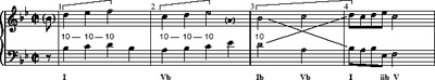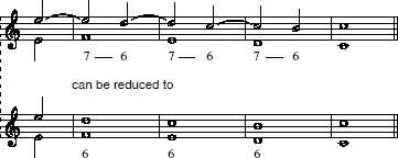 Here a dissonance is created by delaying a fall to the main harmony note, so that the treble and bass are ‘out of step’ with one another. The dissonance in this case must be prepared and resolved downwards by step. Suspensions are usually referred to by two figures indicating the interval between the dissonant notes and the interval between the consonant notes to which they resolve. The commonest forms of suspension (using numerals to indicate intervals above the bass) are 4–3, 7–6 and 9–8 (6–5 patterns are not strictly suspensions, since the sixth and fifth are both consonant). Example 10 shows a simple chain of 7–6 suspensions. In reducing suspensions to a more fundamental linear progression, we simply need to realign the two voices such that they are consonant with one another.