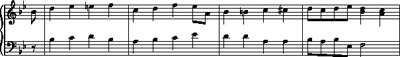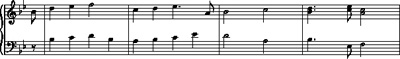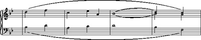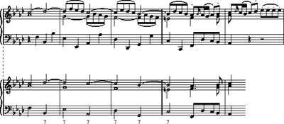 Return to Example 1 and consider bars 3–4 of Mozart's theme. Here we have an ascending line through a third (B♭, C, D). Each of the three notes in this line is elaborated by an upper appoggiatura (C, D, E♭), which in each case is dissonant and must resolve down to the harmony note. One possible reduction of these two bars is shown in Example 7a and can be heard in the audio clip below.