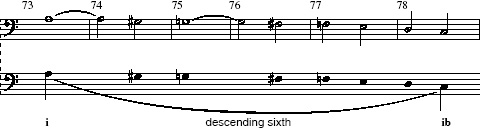 If we look at the bass from bar 73 onwards, we can see a beautifully logical descending line starting with A, and moving step-wise through some chromatic pitches to its goal, the lower C (Example 6).