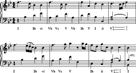 Listen carefully to the recordings of the two passages below, following the music in Examples 1 and 2 also below. The examples are marked with roman numerals to identify the chords used in each. Make a list of the musical features that these examples share. What are the differences in effect between Mozart's version and mine? Which is more logical and satisfying, and why?