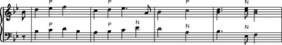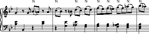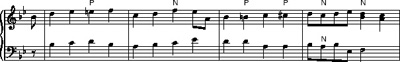Because all the notes marked ‘N’ are dissonant, it would be theoretically possible (as with passing notes) to remove each of them, and be left with a simpler form of the music which would still make sense as a piece of counterpoint between upper and lower parts.