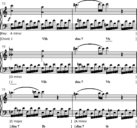 This exercise was intentionally difficult! Example 5 shows my suggestions of how a chord-function analysis might describe the whole of the extract. Clearly it begins and ends in A minor (chord i in bar 73, chord ib in the second half of bar 78), but it seems to pass through the unrelated region of G minor (starting in bar 75) only to return via C major (bar 77; see Example 5).
