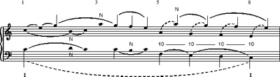 The giant leaps in the flute part clearly suggest that a multi-voiced melody is at work. In fact, the melody is in three strands. When we hear the passage, the ear tends to connect the upper pitches and hear them as a single line; likewise the lower and middle pitches. These strands are harmonic voices: they move in counterpoint with one another, obeying the basic principles of dissonance treatment. So overall, Vivaldi makes his extremely virtuosic solo line do the job of three lines of counterpoint. If we make a reduction of the flute line, we can see how, on its own, it expresses three contrapuntal parts. The reduction is given as Example 5.