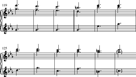 I hope that you were able to hear two lines (A–G–F–E) moving in parallel in these bars. The semiquaver runs that connect each pair of notes can be called miniature ‘octave progressions’, or ‘8-prg.’ for short. We might call these lines a sort of ‘treble’ and a sort of ‘alto’. This would not really be quite right here, though, because rather than moving in counterpoint like the earlier examples from Vivaldi and Bach, these lines are merely a doubling of a single voice at the octave. This technique is quite common in Mozart's sonatas. It is not an example of contrapuntally incorrect ‘consecutive octaves’ but a good (if simple) example of how two or more voices can exist within a single melodic line.