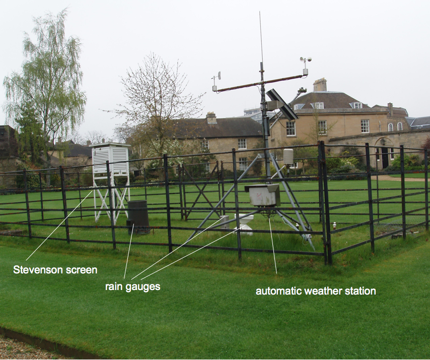 Measurements taken with the instruments shown here include maximum and minimum air temperatures, soil and ground surface temperatures, precipitation, hours of sunshine, wind direction, visibility and cloud cover. The small gantry supports automatic monitoring instruments. Measurements must be made in a standard way at all observing stations, anywhere in the world, if meaningful comparisons are to be drawn between data gathered in different places. To this end, weather measuring instruments are sited away from buildings, trees and large objects, and wherever possible placed on grass, unless otherwise specified. See also Weather station 1, MI001.