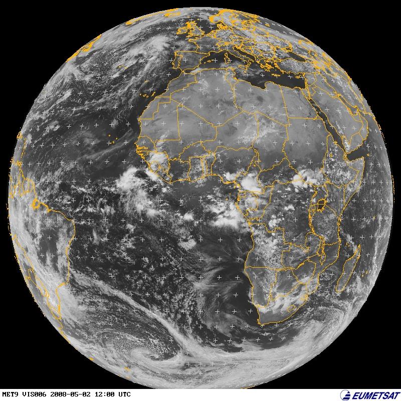 A visible image taken from the geostationary satellite Meteosat SEVIRI (placed over the Greenwich Meridian, longitude 0°) at 1200 UTC on 2 May 2008. The outlines of countries are overlaid and there is also a grid of reference marks (+). This image is illuminated by sunlight and the brightness indicates the amount of light that has been scattered back to the satellite; clouds appear white and the oceans (where cloud-free) appear darker than the land. Strong convective cloud activity can be seen in equatorial regions, whereas at mid- and high latitudes clouds indicate the presence of large high- and low-pressure systems and frontal structures; a good example is a weather system over the South Atlantic.