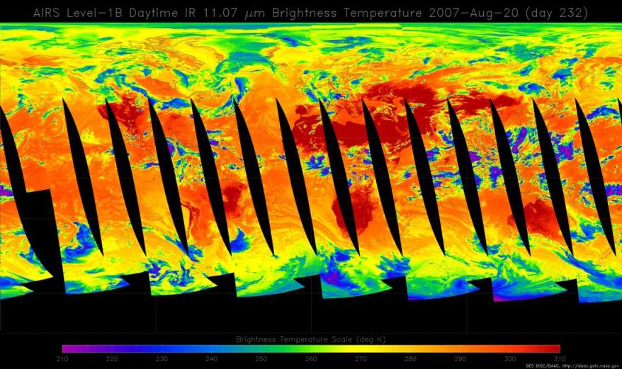 A mosaic of infrared images taken on the day-side of the Earth by the Atmospheric InfraRed Sounder (AIRS) from a polar-orbiting NASA satellite, Aqua, on 20 August 2007. Aqua has been placed in a 705 km altitude, 99 minute period orbit, which passes within 10° of the poles. On each orbit, the satellite crosses the Equator when the local time beneath it is 1:30pm on the day-side and 1:30am on the night side. A false colour image has been used to indicate temperatures, with the spectrum from violet to red corresponding to increasing temperature. (The key gives actual temperatures on the Kelvin scale; subtract 273.15 from these values to get the temperature in degrees Celsius.) All the images taken by the satellite during the day have been projected onto a regular latitude-longitude map. The continents are clearly visible and much warmer than the oceans. Each nearly vertical stripe which makes up the full image was taken on the day-side of the Earth on a successive orbit in the same 24- hour period. Each vertical stripe of the image was taken on the day-side of the Earth during each orbit. The date of the image was chosen to match the geostationary images from GOES East (MI025, 027, 029) for comparison; part of Hurricane Dean is seen in one stripe, but the day-side images do not quite overlap at low latitudes and so the rest of it is not seen.