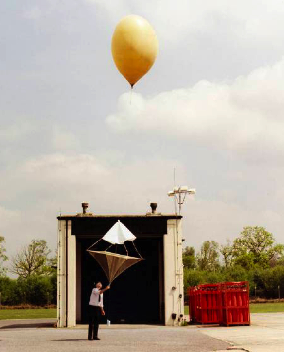 Radiosondes are carried on balloons. They transmit by radio their position (using GPS), air temperature, humidity and pressure. The sensors are all electronic. \\\\*See also Radiosonde 2, MI035.