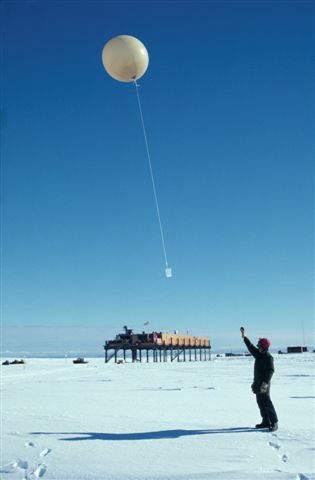 Radiosondes are so-named because they probe the atmosphere (the French word 'sonde' means probe) and radio information back to Earth. They are launched into the atmosphere on a balloon and normally rise right through the troposphere and into the stratosphere (about 25 to 30 km above the Earth's surface). Notice how big the balloon is in relation to the size of the payload. See also Radiosonde 1, MI034.