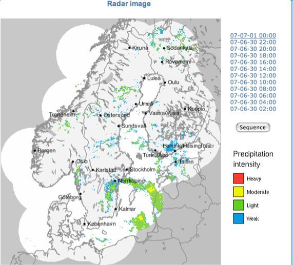 This image shows a composite precipitation image from weather radar networks in the Nordic region of Europe. The overlapping circular areas correspond to the coverage of individual stations (this is often called their 'footprint'). There are 30 weather radar stations in Norway, Sweden, Denmark, Finland and Estonia and data sharing among them generates a composite image in real time, which is updated every two hours. Notice the colour scale that shows the intensity of the precipitation.