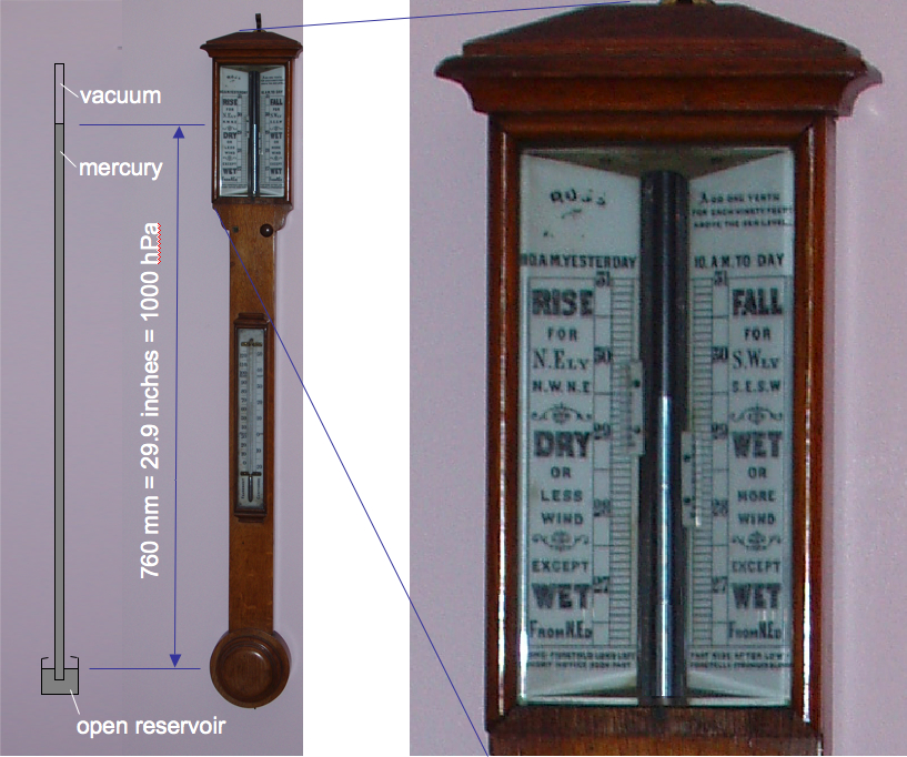 This barometer uses a mercury-filled tube to indicate the amount of pressure that the atmosphere exerts on a surface. The tube is sealed at its upper end and is initially set up completely filled with mercury when horizontal. It is raised to the vertical while keeping the open end submerged in mercury. The mercury sags, creating a vacuum in the sealed end. The pressure of the air is responsible for supporting the column of mercury. About 760 mm of mercury can be supported in this way, several cm or so more when the pressure is higher and several cm or so less when it is lower. Barometers of the age of the one shown here are often marked in inches rather than millimetres. This one also includes markers and labels for the mid-latitude weather associated with changing pressure. A thermometer is included for good measure. See also Aneroid barometer, MI010.