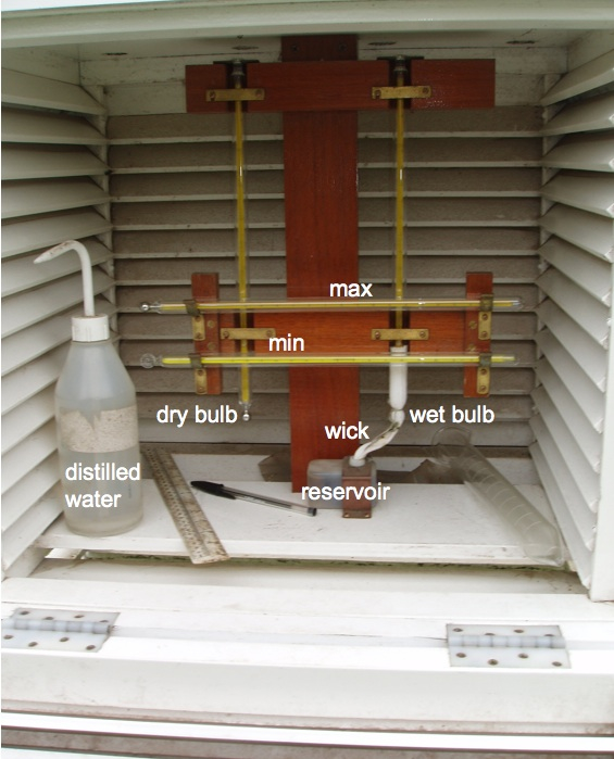 Inside the Radcliffe Observatory's Stevenson screen are four thermometers. The dry bulb thermometer (vertical left) measures the still air temperature. The wet bulb thermometer (vertical right) has a fabric sleeve surrounding the bulb, connected by a wick to a reservoir of distilled water. The two horizontal thermometers register the maximum (upper) and minimum (lower) temperatures. See Wet and dry bulb thermometers, MI006, maximum and minimum thermometers, MI007.