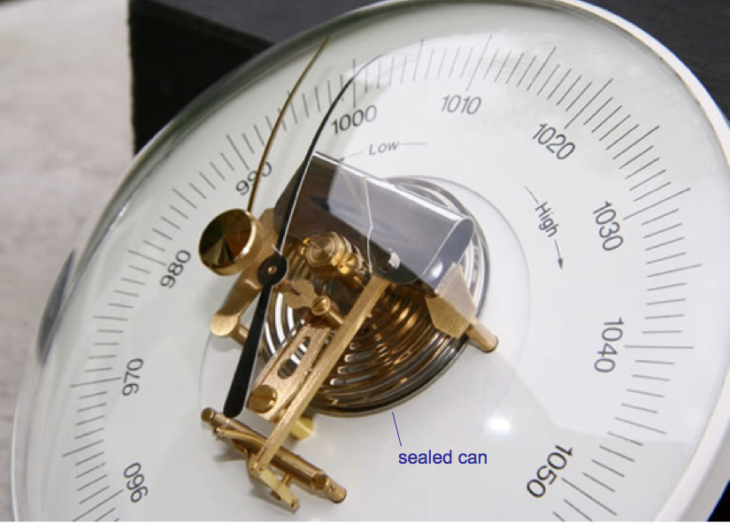 This barometer uses a sealed can shaped like a short fat cylinder. The top and bottom ends have circular ridges that enable the can to expand and contract as the pressure of the air surrounding it decreases or increases. A lever mechanism translates the small changes in the volume of the sealed enclosure into movement of a pointer against a circular dial. In this example, the dial is calibrated in hPa. The mechanism is designed to be slightly stiff, so that the pointer moves more readily when the barometer is tapped and it is easier to see whether the pressure is increasing or decreasing. See also Mercury barometer, MI009.