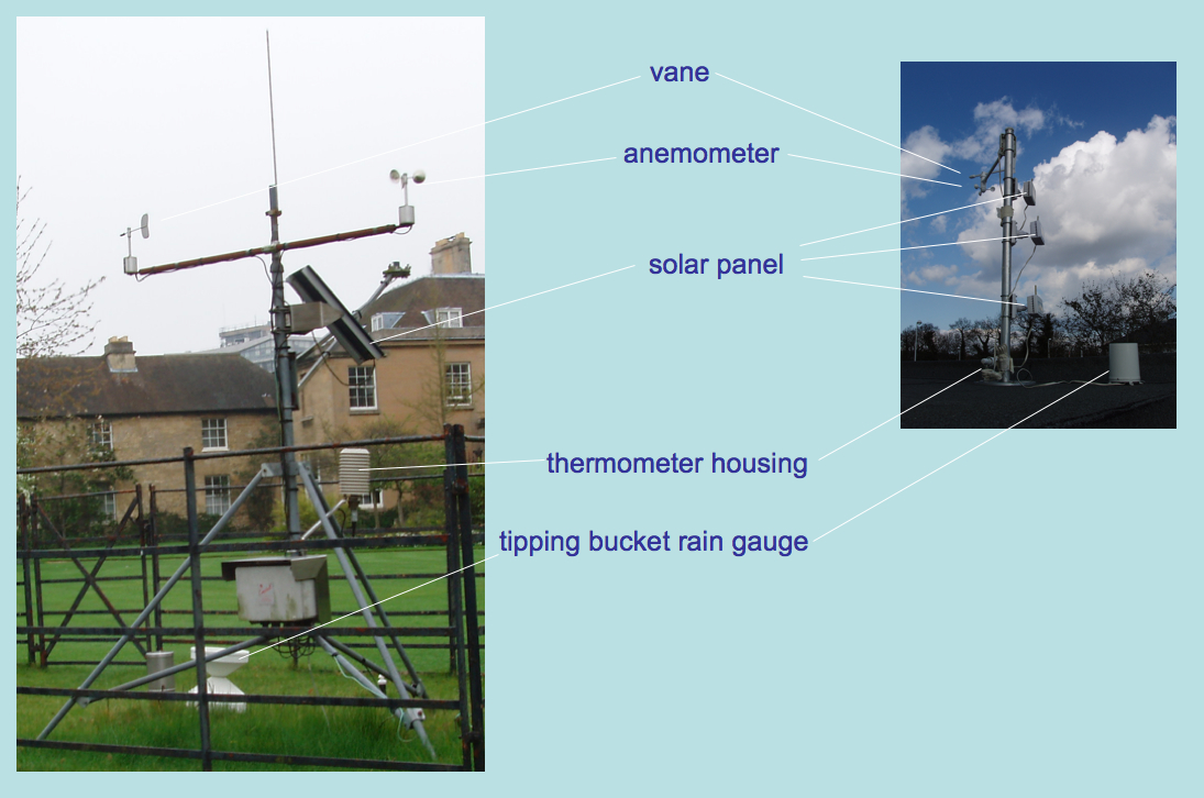 Electronic thermometers and hygrometers similar to those carried by radiosondes, powered by solar cells with a radio link to a base station, are used in automatic instrument stations like these. Both of them also have a wind vane to record wind direction and an anemometer to record wind speed. Left: the Radcliffe Observatory in Oxford. Right: the Abell Observatory at the Open University.