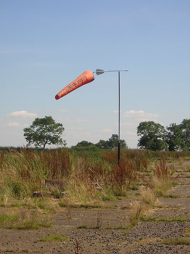 Wind socks are used to give pilots a visual clue as to the direction, strength and steadiness of ground-level winds, from a range of hundreds of metres. They are made from slightly tapered hollowed tubes of fabric, often coloured bright orange to ensure visibility. The wider end of the sock is held open by a stiff ring and is suspended, typically at a height of 3 m above the ground, from a vertical pole. This allows the sock to rotate freely about the pole whenever the wind fills it. The sock aligns with the wind flow provided the wind speed is in excess of 6 kilometres per hour (3 knots). The tapered section is designed to ensure that the sock begins to fill out even in relatively light air movements: it is fully extended by winds with speeds in excess of 28 kilometres per hour (15 knots). The speed of the wind can be inferred from the angle between the sock and the pole. See also Wind vane, MI011.