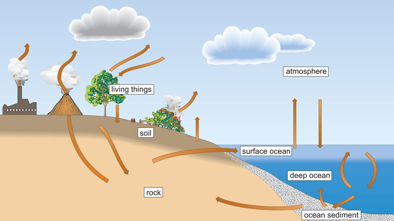 Figure 2 Simple representation of the carbon cycle. All living organisms, not just plants, have structural components that are based on carbon. The pictorial presentation of a carbon cycle illustrates how carbon moves between the reserves found in living things (plants and animals), soil (decomposing organic matter), rocks (including fossil fuels), the atmosphere and the oceans.