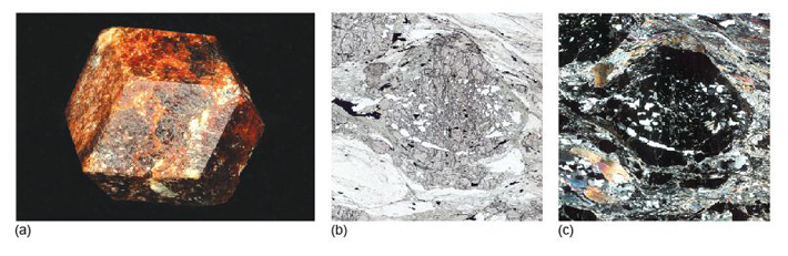 Figure 44 (a) Garnet in its distinctive dodecahedral (12-sided) form, due to its cubic crystal structure (long diagonal of the crystal face is 3.4 cm across). (b) Plane-polarised light image of a garnet in garnet mica schist. Garnet is a high-relief mineral that can be faintly coloured, depending on its composition (field of view 5.5 mm across). (c) The same field of view as in (b) between crossed polars; garnet is isotropic so stays black when the thin section is rotated. The grey and transparent streaks and spots in the garnet are quartz crystals included in the garnet as it grew.