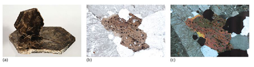 Figure 50 (a) Biotite, showing its strong basal cleavage (larger crystal is 7.5 cm across). (b) Plane-polarised light image of biotite in granite. The biotite displays strong brown pleochroism. The cleavage traces are also obvious and run NW-SE along the length of the grain. Dark circles in the biotite surround small grains of the mineral zircon, which contains small amounts of radioactive uranium. The dark circles are called pleochroic haloes and are due to radiation damage in the mineral structure (field of view 5.5 mm across). (c) The same field of view as in (b) between crossed polars; although biotite has second-order interference colours, they are masked by its strong body colour.