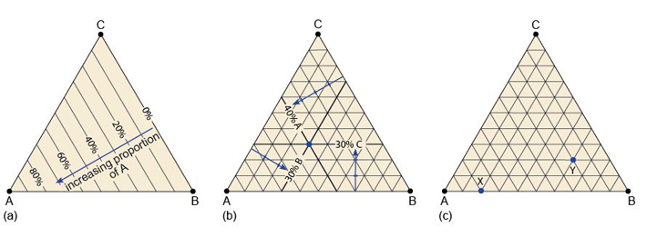 Figure 56 (a) A ternary diagram with three end-member components A, B and C. (b) A ternary diagram with the composition A0.4B0.3C0.3 plotted. The percentages of the end-member components are indicated by thick lines, which intersect at a point that shows the overall composition. (c) A ternary diagram for use with Question 3.2.