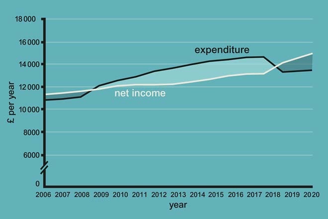 Figure _unit3.4.1 Figure 11 Jenny’s post-budgeting real net income and real expenditure profile, 2006–2020