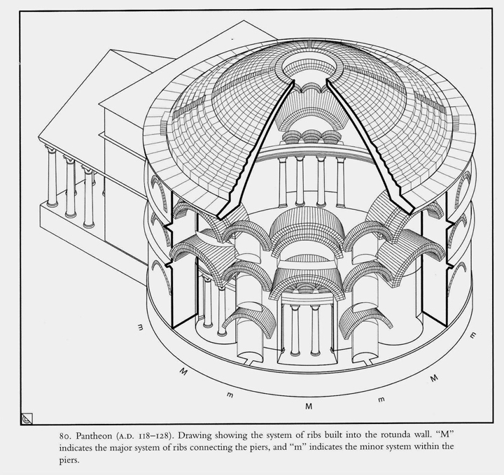 Figure 8 Drawing showing the system of piers and relieving arches built into the rotunda wall. ‘M’ indicates the major system connecting the piers, and ‘m’ indicates the minor system within the piers. Drawing by Lynne Lancaster.