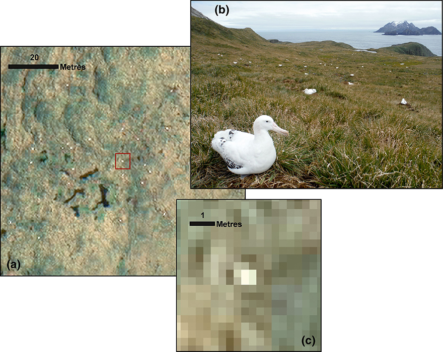 Figure _unit9.4.5 Figure 8 WorldView-3 satellite images of the Chatham Islands, New Zealand, from February 2016, showing white dots assumed to be northern royal albatrosses (Fretwell et al., 2017)