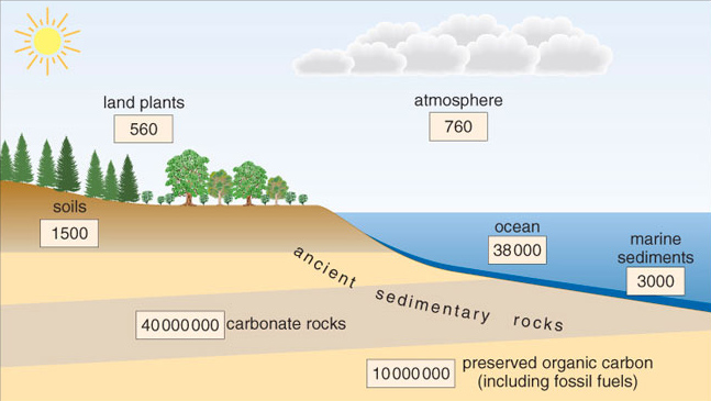 Figure 1.9 The seven major global reservoirs of carbon. Amounts of estimated carbon are in 1012 kg. Only about 0.1% of the preserved organic carbon is in the form of fossil fuels, the rest being finely divided at low concentrations in sedimentary rocks.