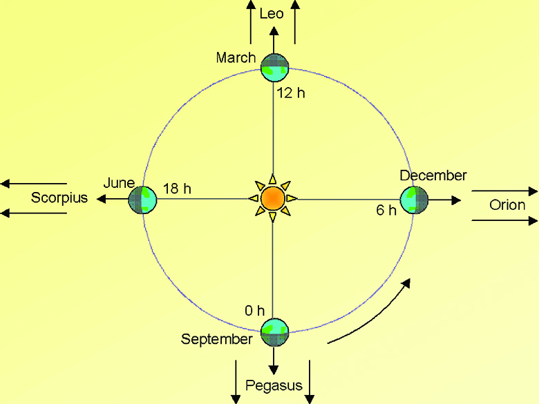 Figure _unit5.3.1 Figure 5 The Earth in orbit around the Sun. In any given month, the night side of the Earth (the side facing away from the Sun) looks out in a different direction into space, meaning that different objects will be visible in the night sky at different times of the year.
