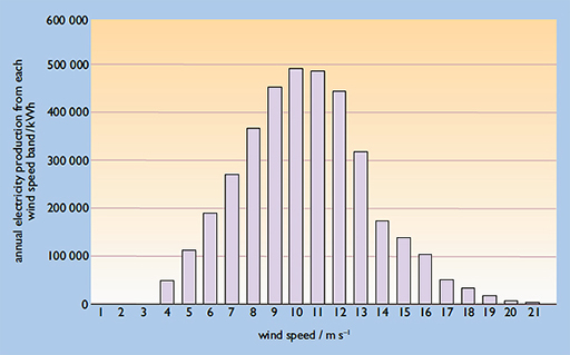 Figure 12 Example of a wind speed – annual energy output distribution curve, showing annual electricity production at each wind speed