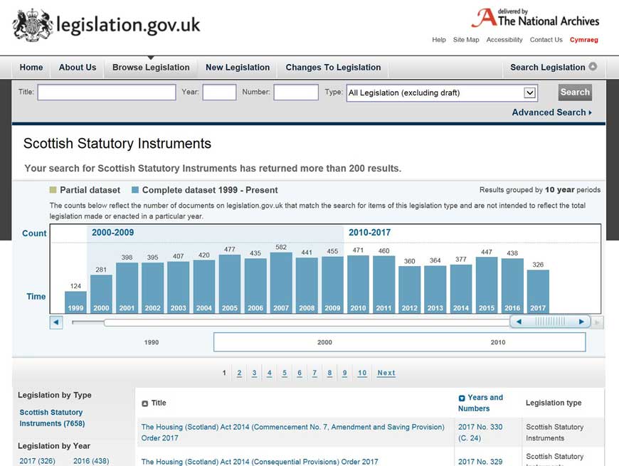 Figure _unit7.2.5 Figure 5 shows the volume of Scottish Statutory Instruments from 1999 to mid-2017. A significant number are passed each year with the highest number in 2007 (at 582).