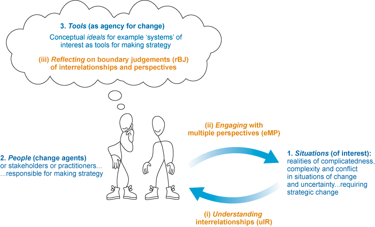 Figure 6 A mental model of a systems thinking in practice (STiP) heuristic comprising three entities: Situations of interest (real-world events), People (stakeholders), and Tools (e.g. systems and other ideas). Associated activities are: (i) understanding interrelationships (uIR); (ii) engaging with multiple perspectives (eMP); and reflecting on boundary judgements (rBJ).