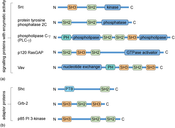 Figure 12 (a) Domain composition of some signalling proteins with enzymatic activity (enzymatic domains are shown in dark blue). (b) Domain composition of some adaptor proteins.