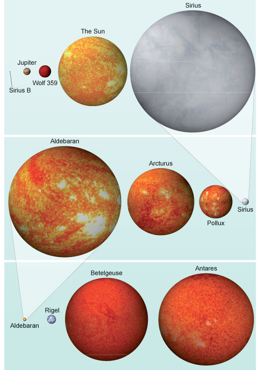 Figure 12 Sizes of stars compared. The colours are indicative of temperature; the bluish stars are hotter than the Sun whereas the orange-red stars are cooler. Jupiter, shown in the first panel, has too small a mass to support the nuclear reactions that power the stars.