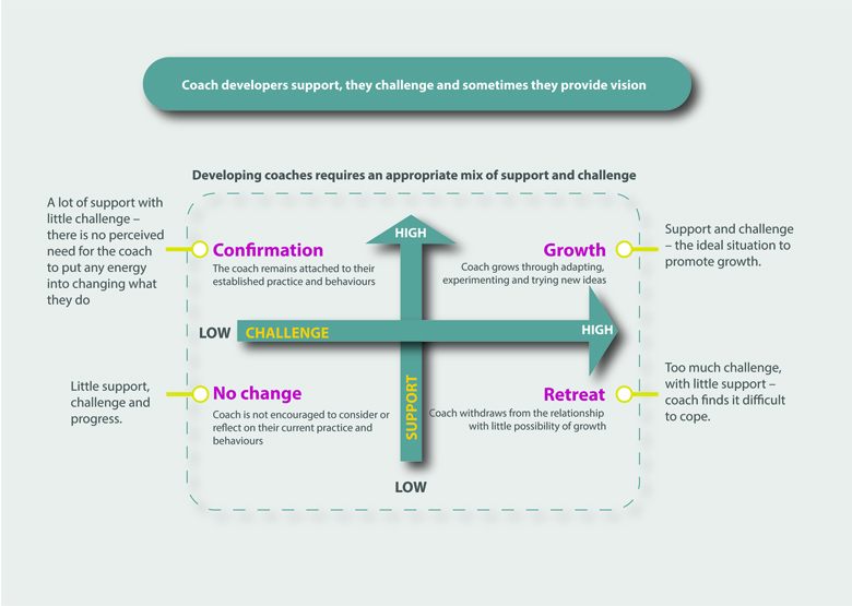 Figure 9 This diagram demonstrates pictorially the balancing dynamics of the coach developer role, between providing both support and challenge to the coach (Source: adapted from Martin, 1996; Daloz, 1986).
