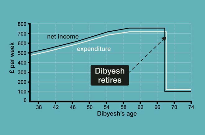Figure _unit7.4.2 Figure 10 Dibyesh’s income and expenditure without any savings for retirement