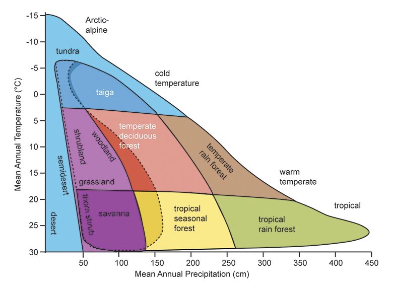 Figure _unit3.5.1 Figure 14 Biome distribution with respect to temperature and precipitation. Each biome occurs in special zones limited by availability of water and temperature.