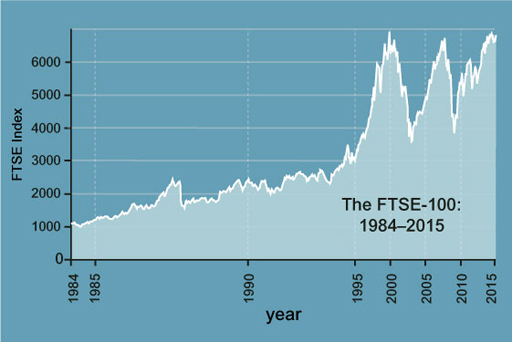Investing solely in equities is more suited to long-term investment. If someone is retiring in a few years’ time, then investing solely in equities may be very risky. Looking at the graph in Figure 2 of the movement in the level of the FTSE 100, imagine what would have happened to the value of their investments if they were only holding shares and they retired in 2002/03 – they would have seen the value of their fund severely hit. If, on the other hand, someone is 25, with 30 years or more to save, they can afford to invest more in equities. If not saving directly, but through a company pension fund, the pension fund managers will look at the age distribution of the members of the scheme when deciding on the asset allocation.