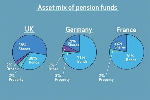 When comparing countries, there are important differences in how assets are combined into funds. Figure 3 shows the asset mix in 2008 for pension funds surveyed in the UK, Germany and France. Whereas, on average, pension funds in the UK had 58% of assets allocated to shares, in Germany only 19% had shares, and in France only 22% had shares. A much higher proportion was invested in bonds: 76% in France and 71% in Germany, compared to only 38% in the UK.