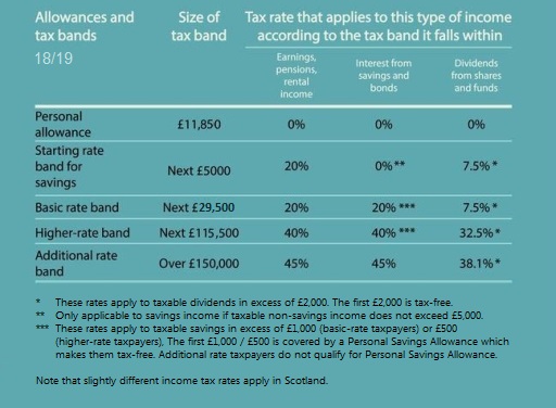 Start by looking at the table to see the details of the allowance and tax bands for different forms of investment in 2018/19.