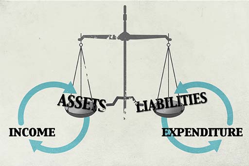 In reality, these scales would be in constant motion, as money continually flows into and out of individuals’ and households’ pockets, and the value of assets and liabilities is continuously changing. For the sake of simplicity, assume the scales have stopped at a particular point in time. This allows an exploration of both how assets relate to income and how liabilities relate to expenditure.