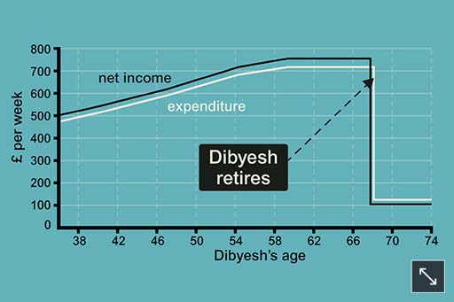 The pension provider helps Dibyesh to work out that to produce a pension of £6500 a year by age 68, Dibyesh needs to start saving about £250 a month, assuming he increases this each year if his earnings rise. This means Dibyesh will need to save about 12% of his net income year after year. He is already saving some of his income each month but this is earmarked for other things. To save enough for retirement, Dibyesh decides he will have to cut back his current spending.