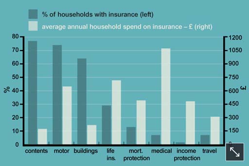 You can see from the chart the actual uptake of various types of insurance in the UK. The chart also shows the average expenditure on each type of insurance policy by those households that buy them, although it doesn’t include insurance cover provided through employers, so it understates total insurance expenditure.