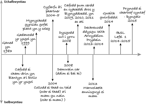 Mae'r darlun hwn yn dangos llinell amser Claire ar draws canol y dudalen gyda saethau yn pwyntio i fyny sy'n nodi uchafbwyntiau yn ei bywyd a saethau yn pwyntio i lawr sy'n nodi isafbwyntiau yn ei bywyd.
